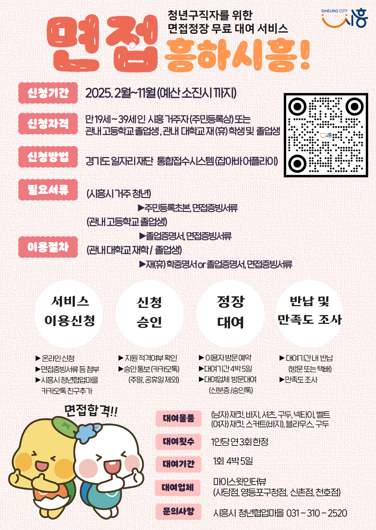 면접 흥하시흥 서비스는 시흥시에 거주하는 19세부터 34세까지의 청년들을 대상으로 하는 프로그램입니다. 서비스 기간은 2024년 2월 1일부터 12월 31일까지이며, 예산 소진 시까지 진행됩니다. 이 서비스는 면접을 준비하는 청년들에게 실질적인 도움을 주기 위해 기획되었습니다. 신뢰할 수 있는 정장 대여를 통해 청년들이 자신감을 가지고 면접에 임할 수 있도록 도와줍니다.