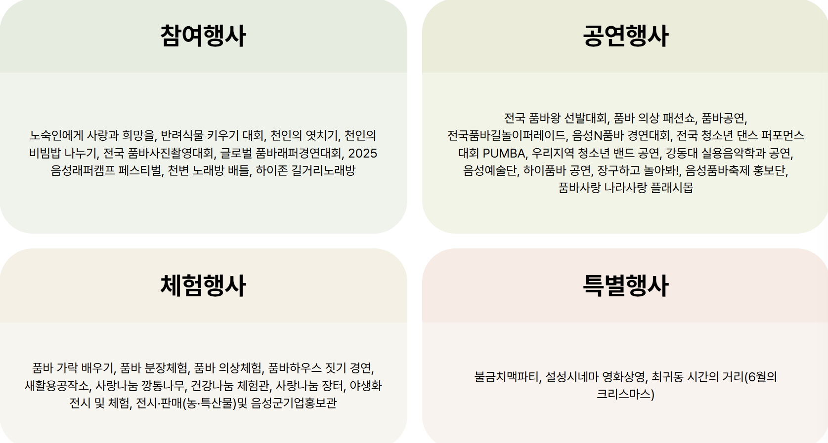 - 숙박: 음성군 내 다양한 숙박 시설이 마련되어 있으며, 사전 예약을 권장합니다.
