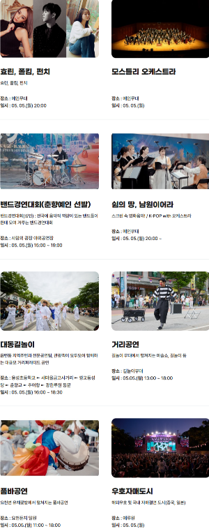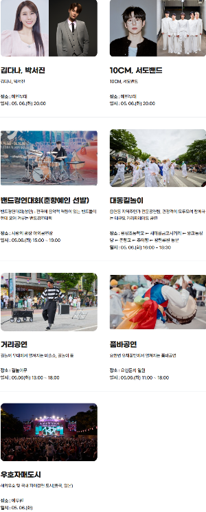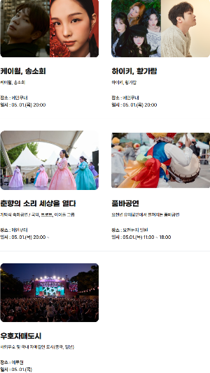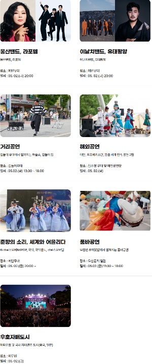 올해 춘향제에서는 다양한 아티스트들의 공연이 예정되어 있습니다: