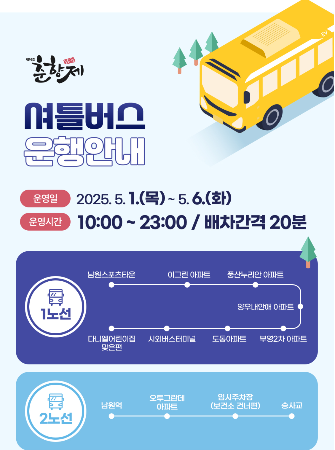 2025년 4월 30일(수)부터 5월 6일(화)까지, 전라북도 남원시 광한루원 및 요천변 일원에서 제95회 남원 춘향제가 개최됩니다. 올해의 슬로건은 **“춘향의 소리, 세상을 열다”**로, 전통과 현대가 어우러진 다양한 프로그램이 준비되어 있습니다.
